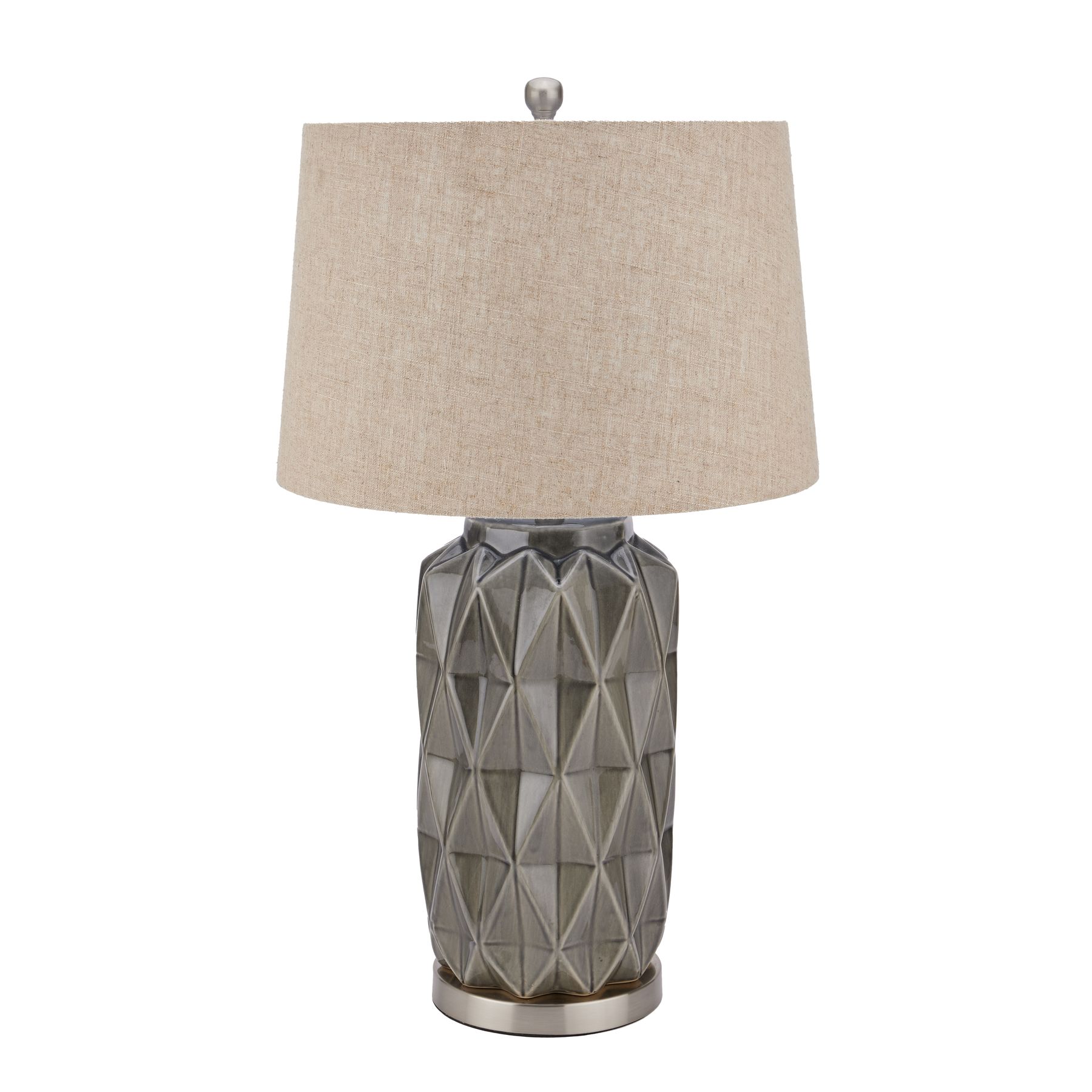 The Acantho Grey Ceramic Lamp has a simple yet detailed aesthetic which lends itself to a wide range of interior schemes. The ceramic base is finished in a warm grey tone and displays a stunning sculpted geometric pattern, complete with a contrasting brushed chrome bottom. Once switched on the light gently filters through the natural linen shade.