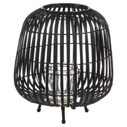 This is the Black Wicker Convex Lantern. Beautiful in its simplicity, this item picks up on two important and growing trends: natural sustainable materials and a dark/black colour palette that customers will be seeking to add to a variety of interior spaces. This wicker lantern encases a glass candle-holder which we recommend filling with one of our amazingly realistic real-wax LED candle collection rather than real flame alternatives. Its contrasting rope handle detail adds to its natural credentials. These items are likely to sell well in sets of three or more, thanks to the variety of size and shape available.