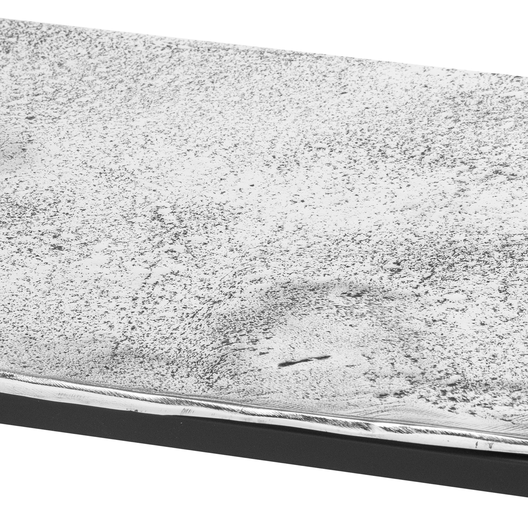 This is the Farrah Collection Silver Console Table. Hand cast in aluminium, the casting process lends this piece a pitted, textured surface which is both eye-catching and hardwearing. Designed with versatility of use in mind, the Farrah furniture collection comprises sturdy pieces which are also light enough to move around your home. With legs in a contrast painted black, the collection will be a perfect fit with contemporary homes. Use this item’s stunning surface to display a favourite table lamp and collection of home matching accessories from the Farrah range. This item’s narrow, slimline shape makes it a fantastic choice for hallways and dining rooms where space can be limited.