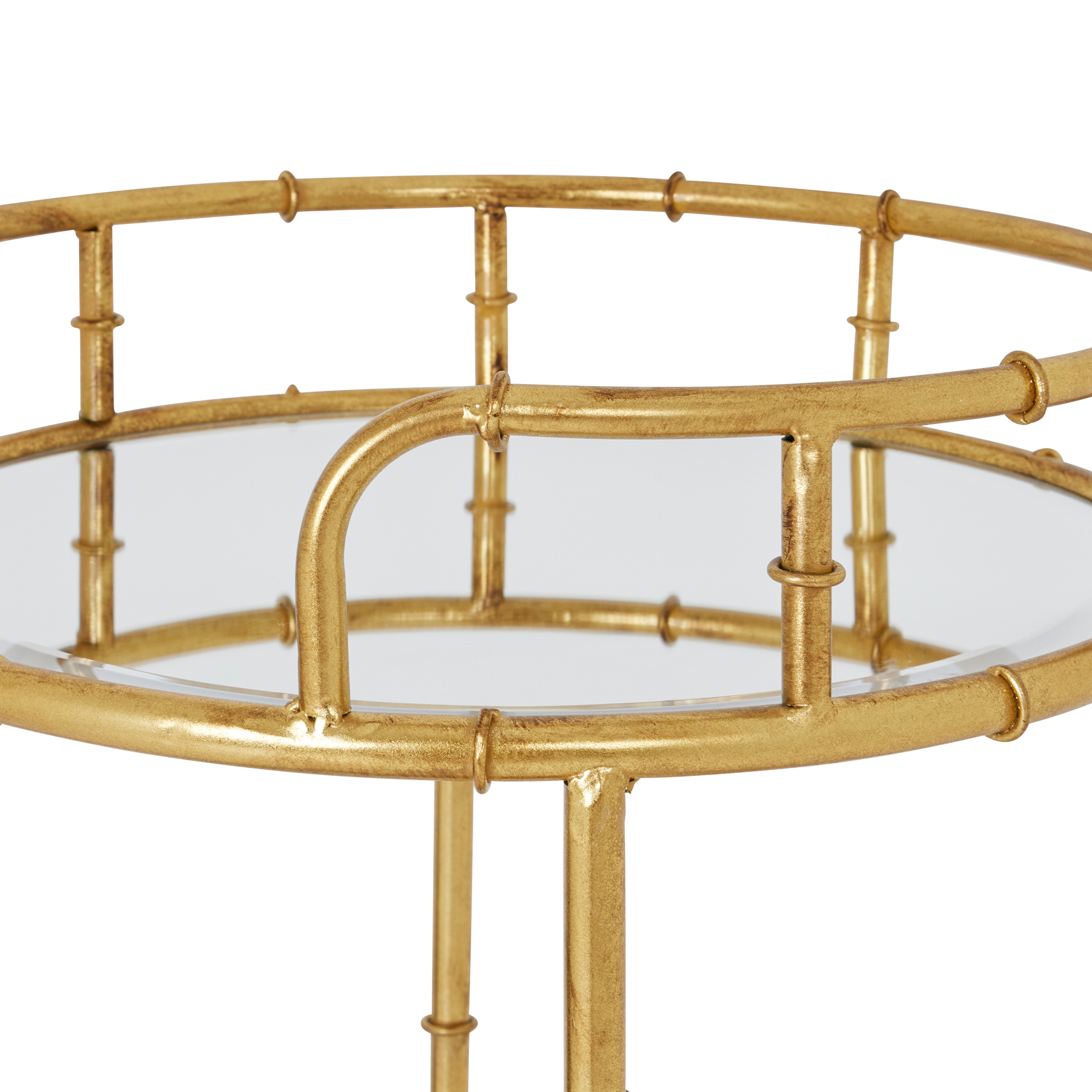 This is the Gold Round Drinks Trolley. Create your own mini bar with this stylish drinks trolley and keep your favourite tipple close to hand. This moveable and compact drinks trolley is perfect for home-entertaining. With two mirrored surfaces, this gold coloured metal trolley has space for both drink mixing and display. Elevate your home’s entertaining capabilities with this moveable mini bar option.