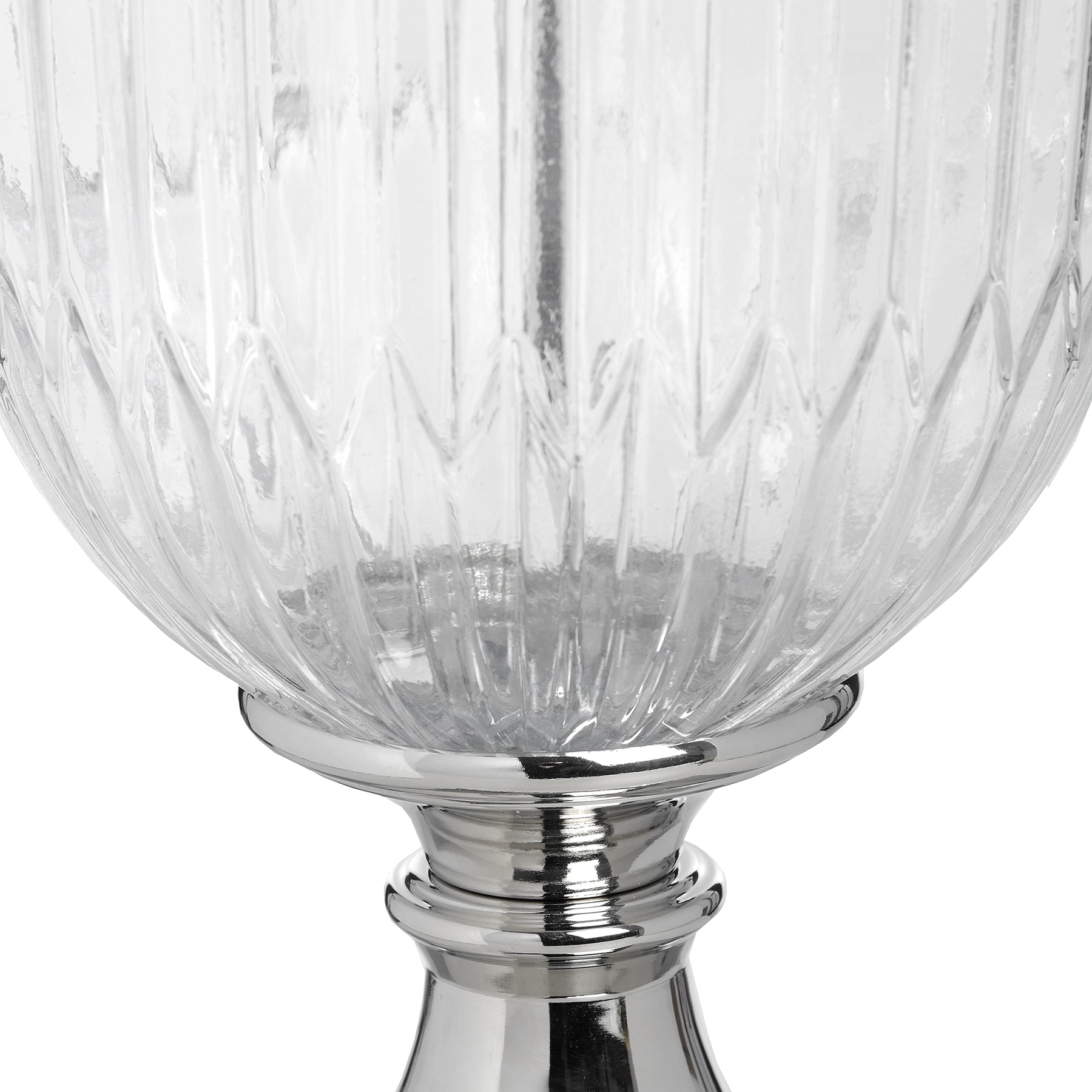 Urn-shaped, glass table lamp with metal base and top, supported by a square plinth. Comes with a textured, grey fabric shade and has an in-line switch. E27 Screw Bulb