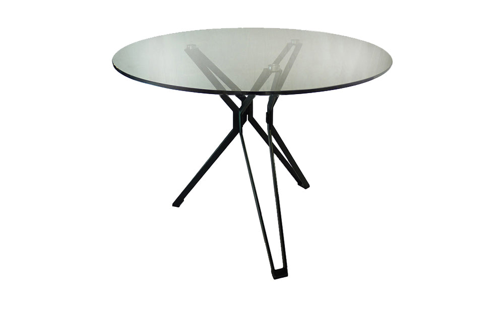 Details – Dining table with glass top with dark grey powder-coated metal legs.